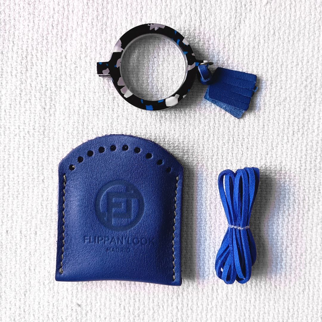 Realizadas con acetato en tonos marrones y beige, negro y azul, con chapoleta y funda de cuero y un sencillo cordón de antelina.