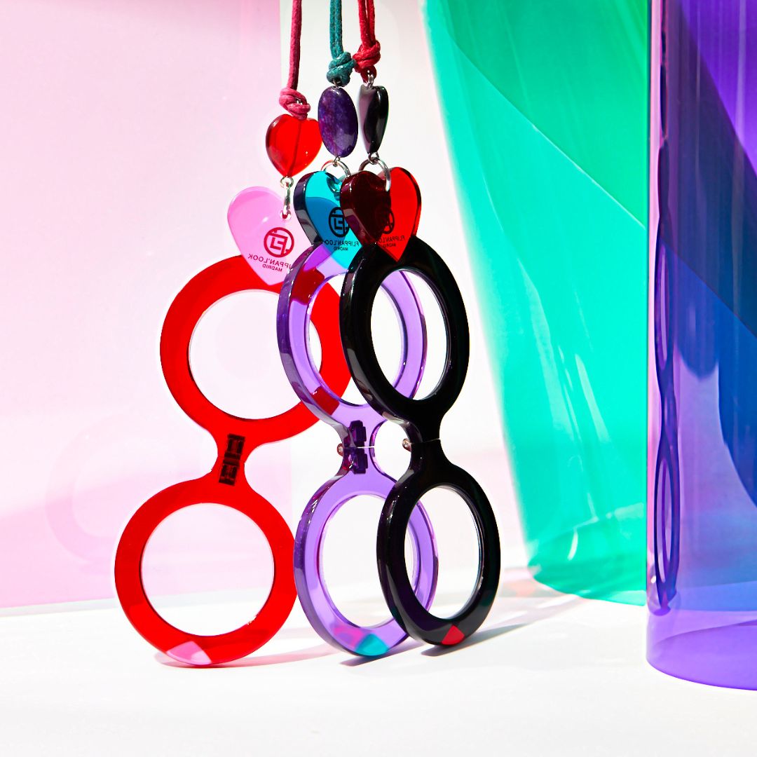 Nuestro modelo Corazón sintetiza todos estos valores en el más importante de todos ellos, el amor. Lleno de color en acetatos combinados en negro-rojo, morado-verde y rojo-rosa.