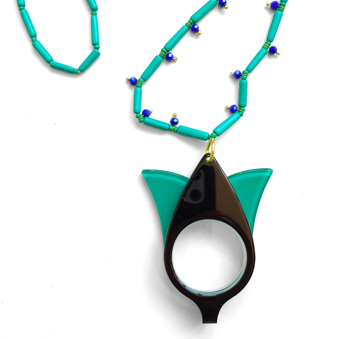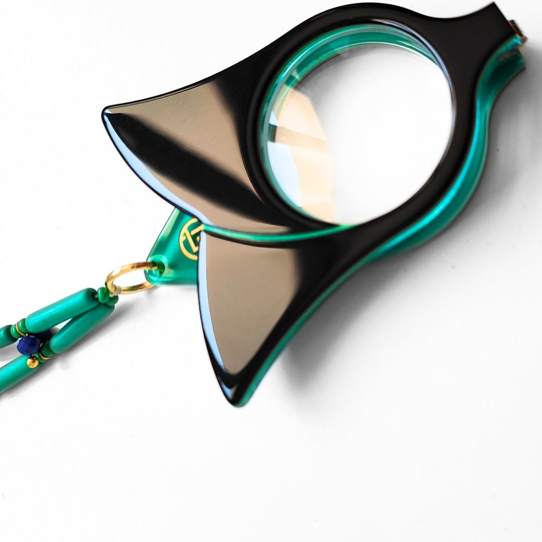 ¡¡Vuelven nuestras gafas Tulipán totalmente renovadas!! Realizadas en acetato de triple capa en color verde oscuro y verde aguamarina, es una pieza minimalista y elegante, con líneas depuradas. Acabado con collar de bolitas de vidrio en tonos verdes y anilla plateada, serán el complemento perfecto para tu look de primavera.