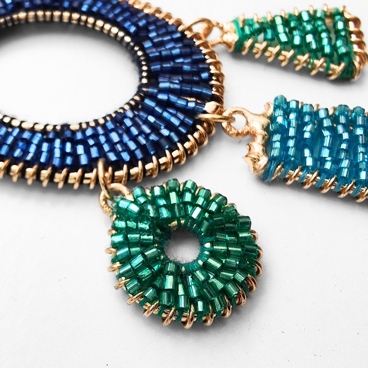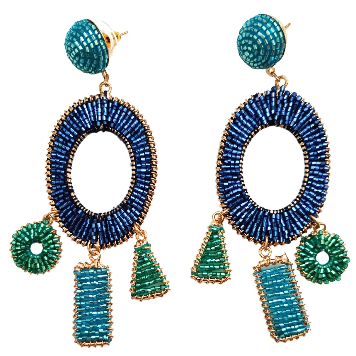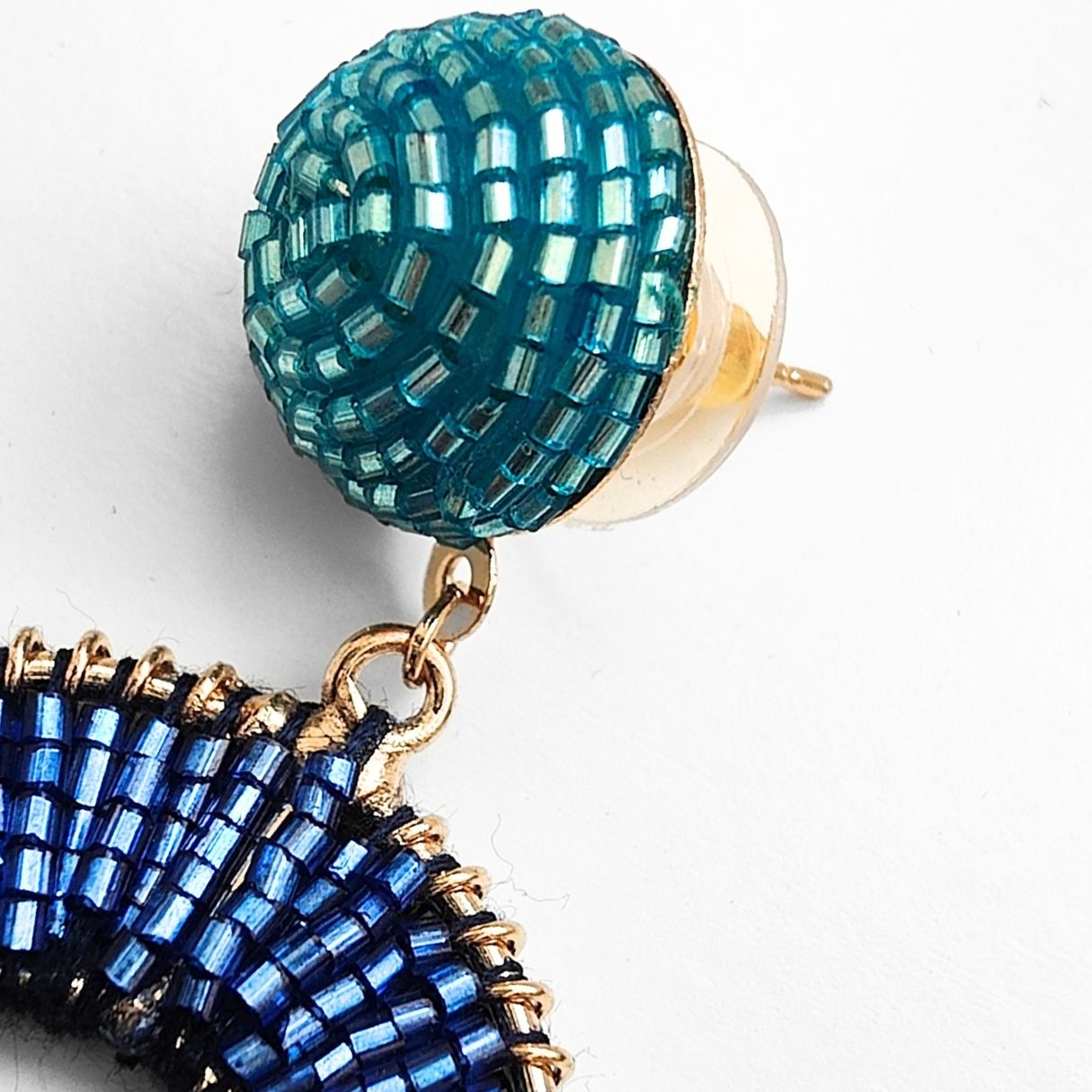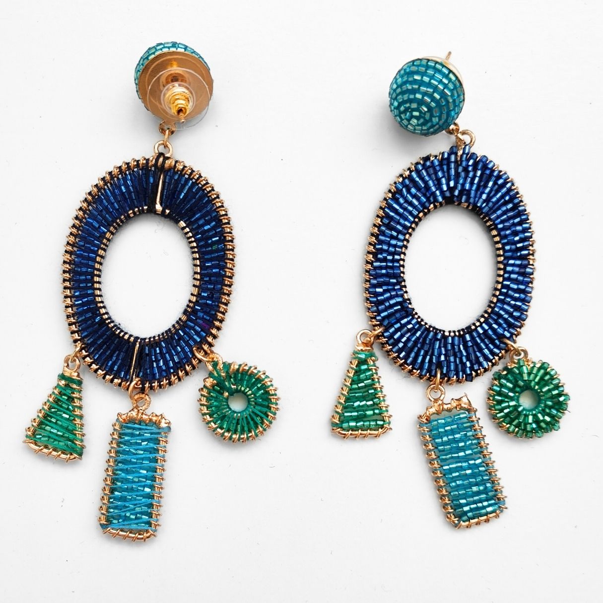 The earrings are made with glass beads in various colors. Each piece is handmade and is truly unique.