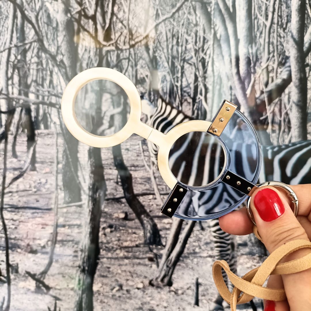 The frames are made of cellulose acetate, organic lenses and the necklaces vary according to the model: brass, steel, leather, suede, velvet, crystal, mother-of-pearl, natural stones, wood, bone.