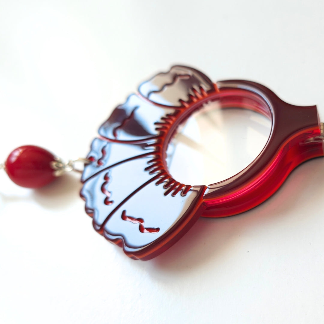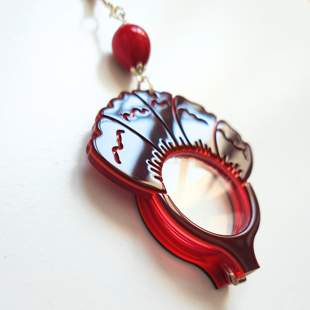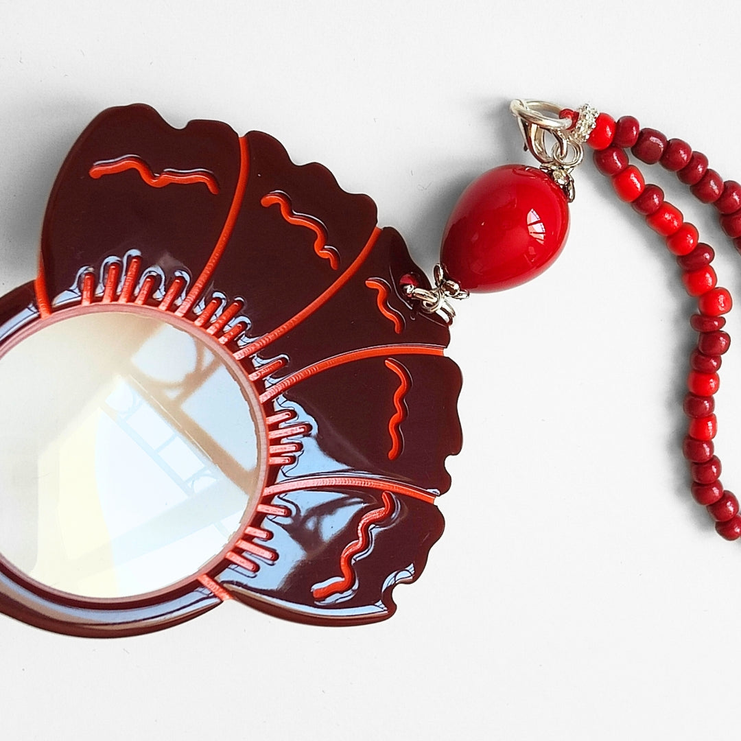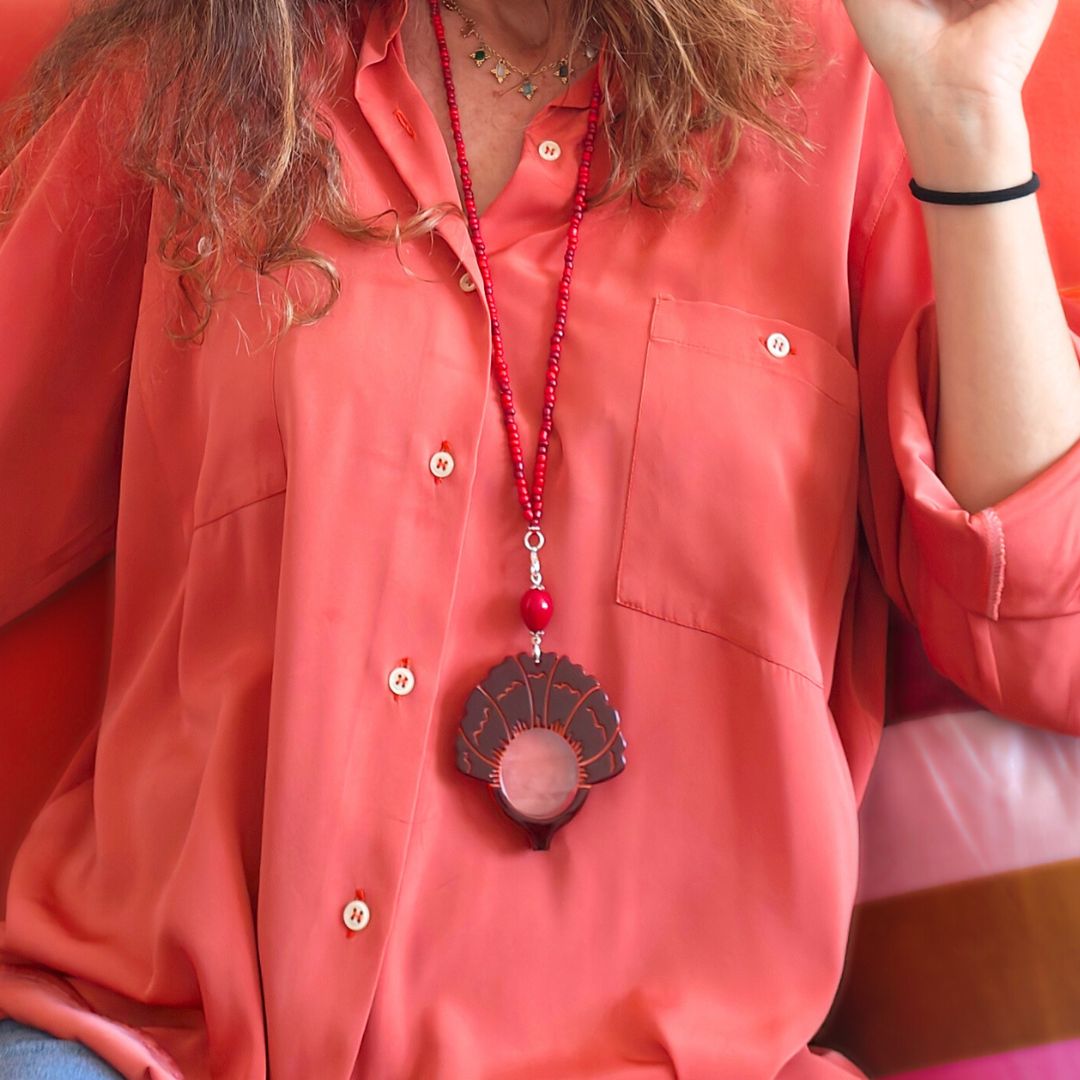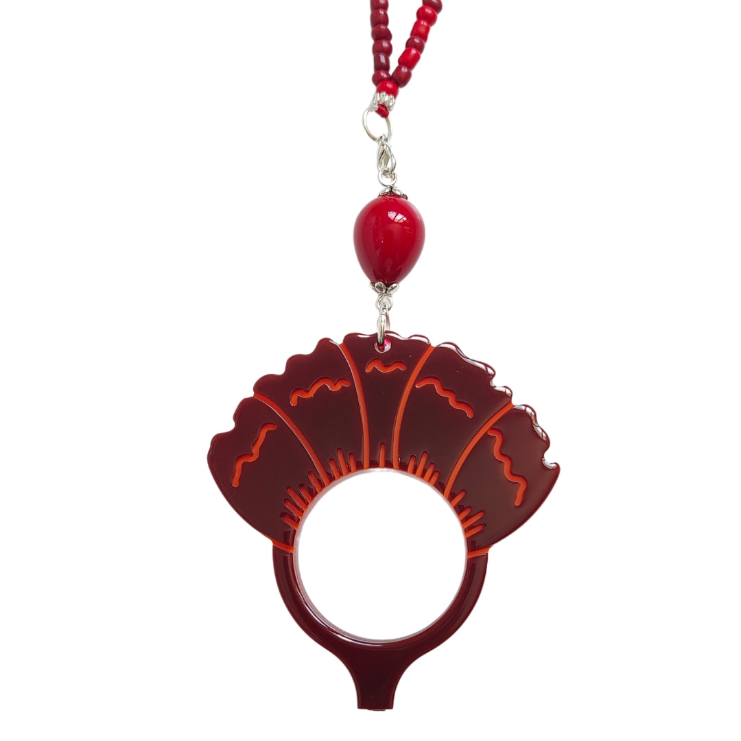 Discover our most folk model! Made of double-layer acetate in burgundy and red, our carnation claims our Andalusian roots. Finished with a necklace of glass balls in red tones and silver ring and red glass beads.