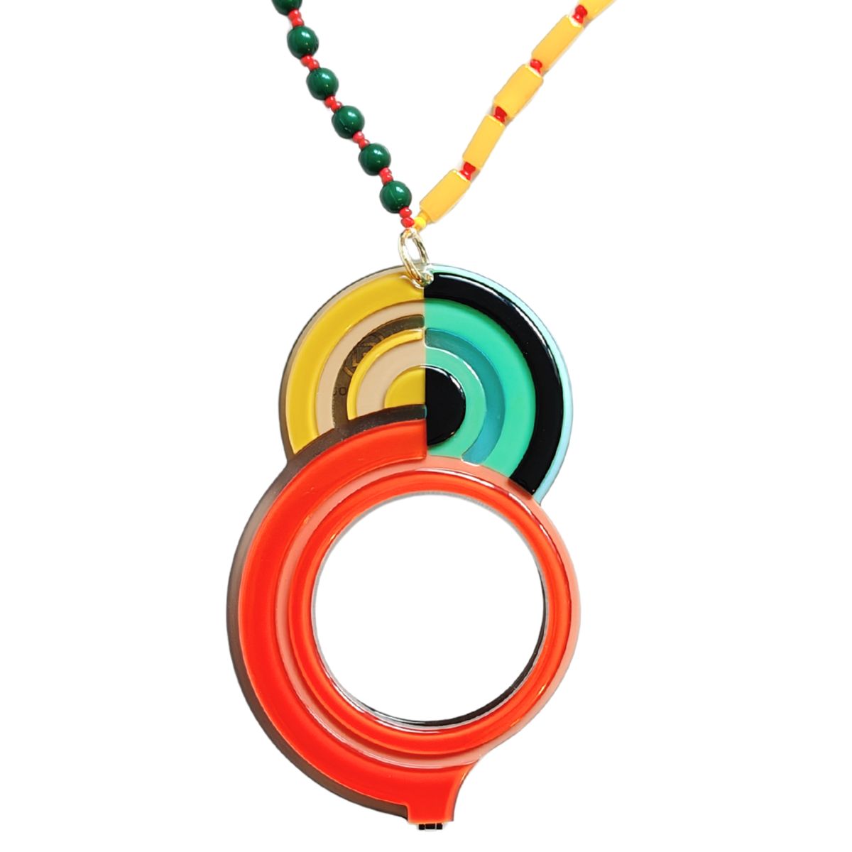 Sus tonos naranjas, verdes y amarillos se combinan con un bonito collar realizado de cuentas de vidrio, madera y resina.