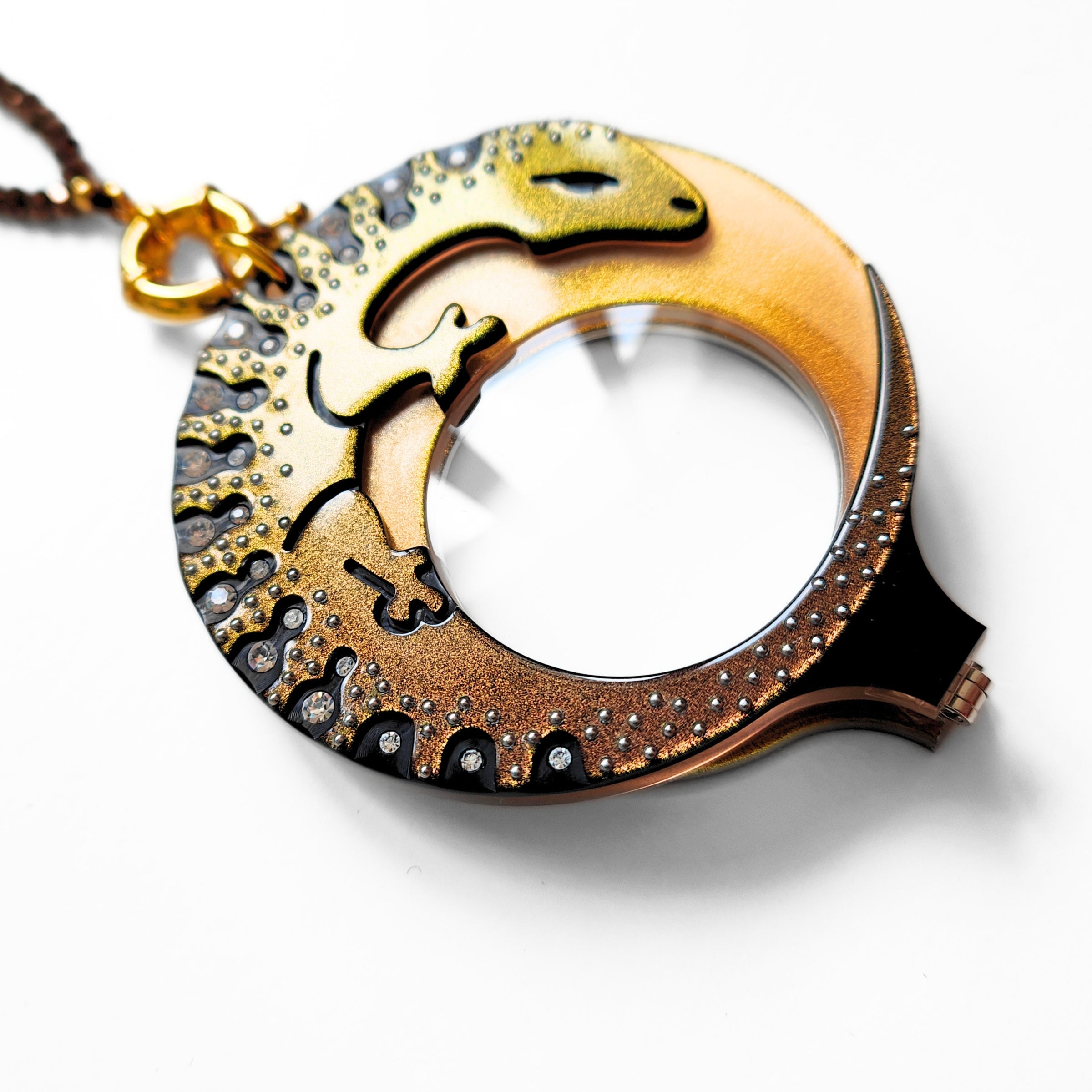 Las gafas presentan una forma circular tallada, con un lagarto ocelado ibérico que se enrosca sobre la lente. Fabricado en un material tornasolado en tonos rosa y verde, con detalles en negro tallado, aplicaciones metálicas y toques de strass brillante, el resultado es una pieza que mezcla misterio, artesanía y belleza natural.
